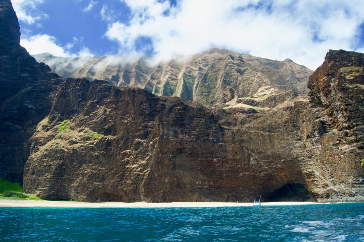 The Na Pali Coast is one of the most beautiful places in the world. This 17 mile stretch of coastline follows the north-west side of the island of Kauai and is only accessible by boat or helicopter. Millions of years of erosion caused by surf, wind, and rain have formed the deep narrow valleys ending abruptly at the sea. Waterfalls and swift flowing streams continue to cut these narrow valleys while the sea carves cliffs at their mouths.