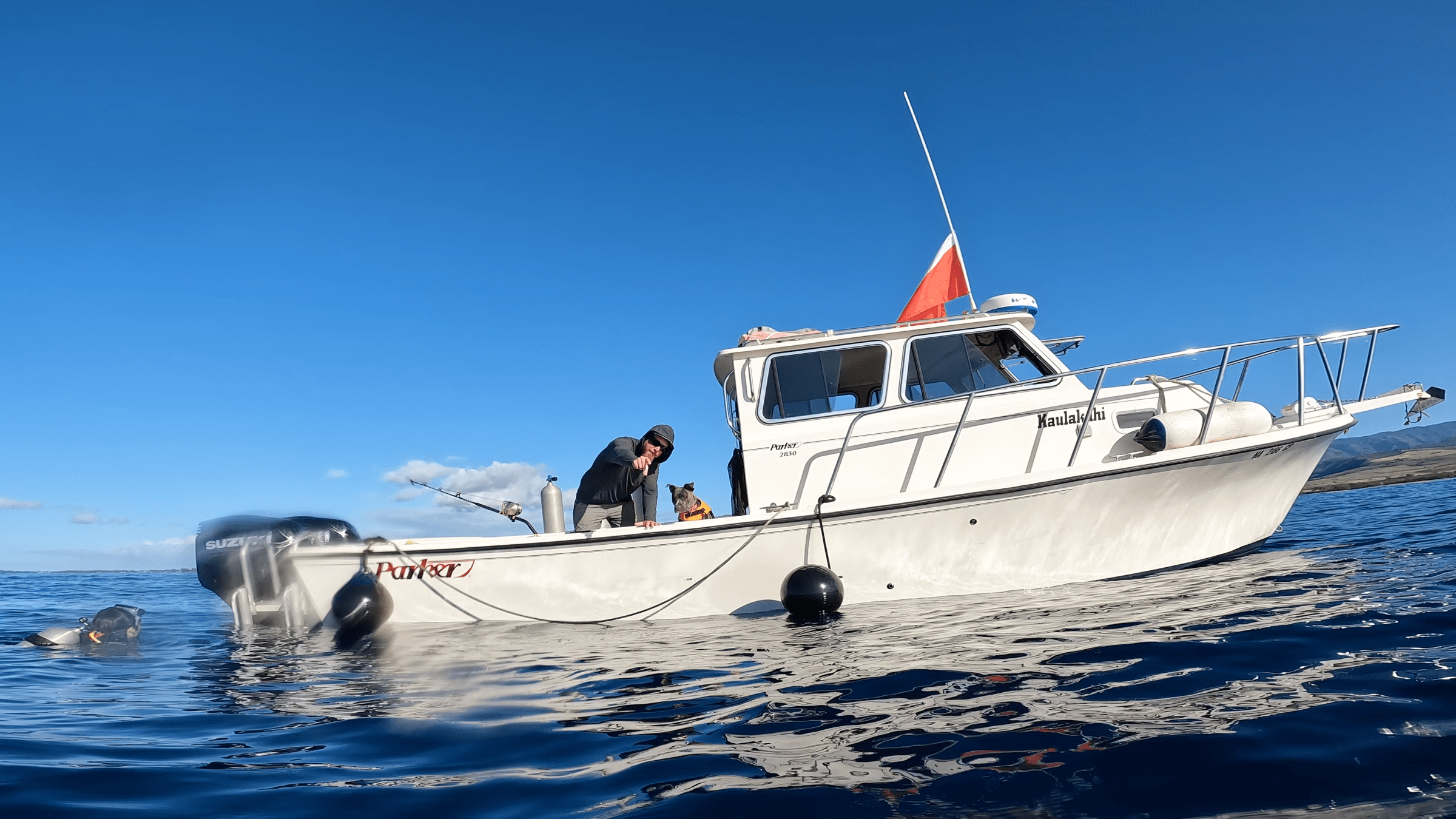 Our dive boat is a 28 foot Parker with a deep V hull that helps slice through the chop better. It has brand new twin 300 horsepower motors that can get us across the channel to Ni’ihau in an hour. On a flat day, well under an hour.